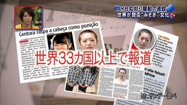 El diario dice que vía Twitter, turistas nipones que viajan por Alemania y Boznia Herzegovina compartieron imagenes de la mundialmente conocida foto de Minegishi cuando se rapó el cabello para implorar el perdón de los wotas al ser evidenciado su romance por el tabloide Shukan Bunshun a finales de enero del 2013. El video donde Minegishi pide perdón entre lágrimas fue viralizado rápidamente y la nota se conoció entonces en 33 países de todo el orbe.