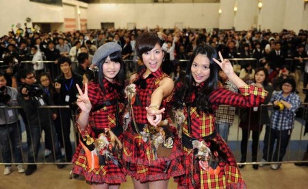 En el evento, las tres integrantes del grupo idol, luciendo uno de sus más adorables vestuarios, atendieron y saludaron de mano a 1,000 kimo-wotas chinos.