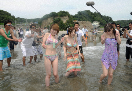 Los medios de comunicación mostraron a los funcionarios municipales en la apertura de la playa de Nakoso en donde tres mujeres locales, quienes son guías de turistas, fueron las primeras en meterse a las aguas de la playa para marcar el inicio de las festividades del día de la marina y los festivales de verano en Japón.