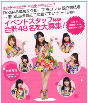 El pasado 6 de marzo en el website de Baitoru, la compañía más grande de Japón especializada en ofrecer trabajos de medio tiempo o parciales, lanzó una convocatoria para contratar a 48 personas interesadas en trabajar los días 29 y 30 de marzo durante los conciertos que AKB48 ofrecerá en el estadio nacional.