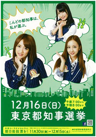 Minami Takahashi (21), Tomomi Itano (21) y Yui Yokoyama (19) aparecen en los carteles junto con el lema: «Elijo al próximo gobernador de Tokyo».