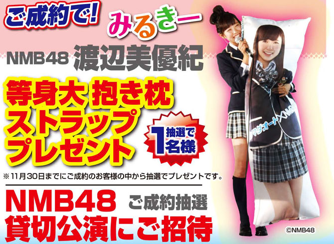 Miyuki Watanabe , integrante de NMB48, compartió el lunes 28 de octubre por medio de su cuenta de Google+ una foto donde aparece junto a una almohada con una imagen de ella impresa de cuerpo entero, la cual será obsequiada en un sorteo a los wotas-otakus que adquieran un automóvil usado en la agencia «Shimada auto», como parte de la campaña promocional que las chicas de Osaka realizan para dicha compañía.