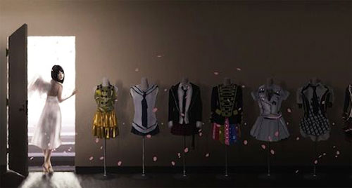 Kojima se presentó al evento vestida tal y como aparece el personaje femenino principal de la historia, utilizando un amplio y elegante vestido azul con un gran moño en la espalda.