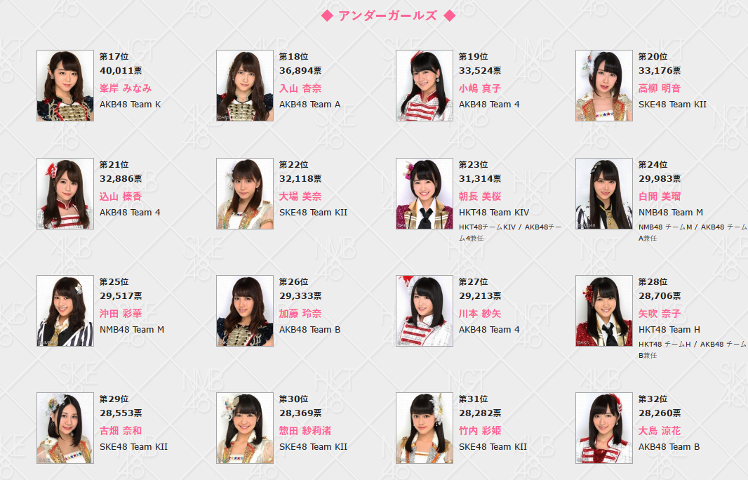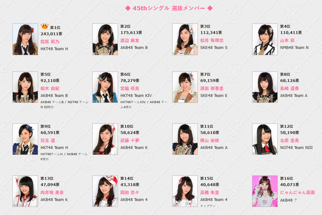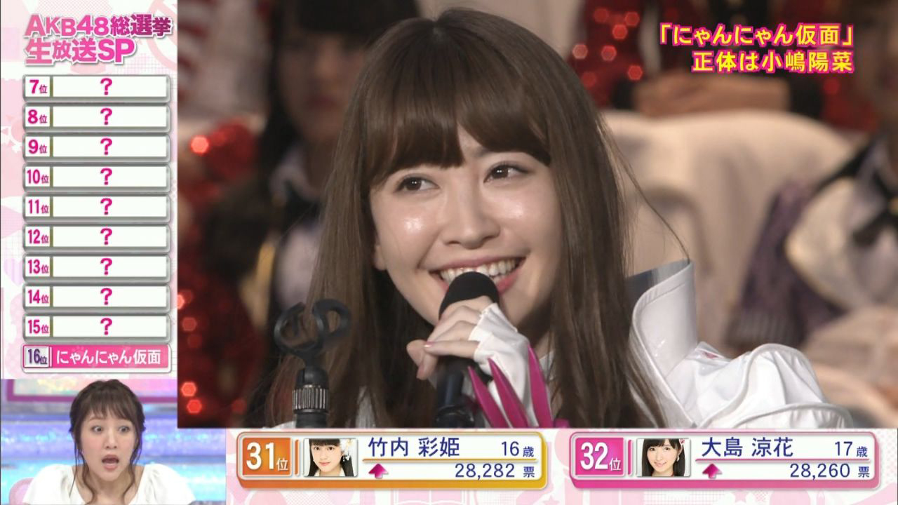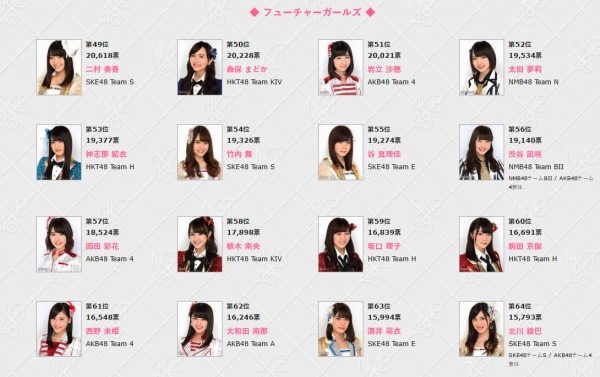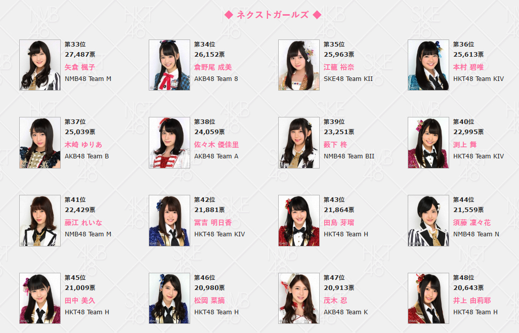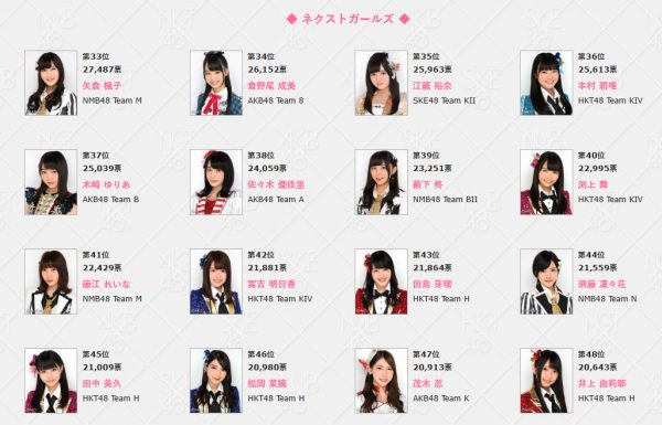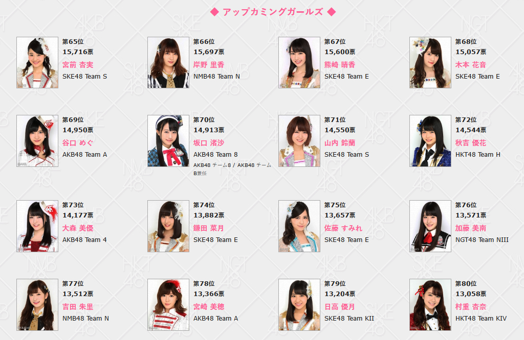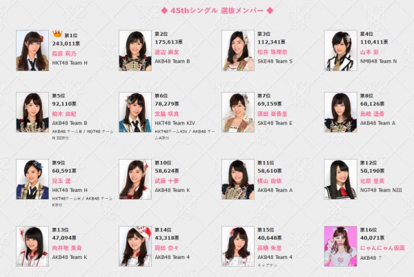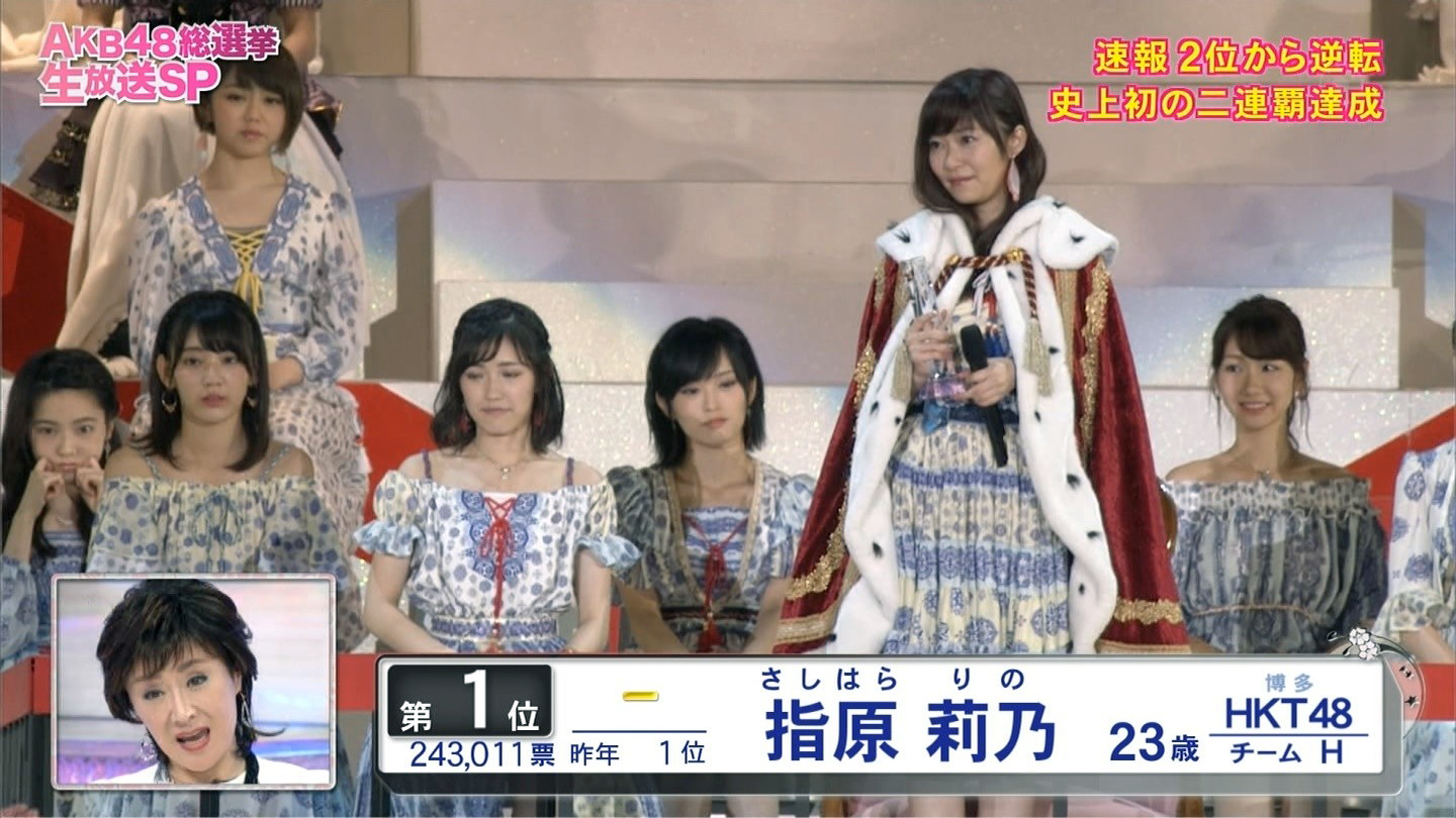 Este año nuevamente Rino Sashihara ocupó la primera posición del ranking, seguida de Mayu Watanabe, quién tuvo que conformarse con la segunda posición, Jurina Matsui en el tercer lugar, Sayaka Yamamoto en cuarto, Yuki Kashiwagi en quinto, Sakura Miyawaki (6), Akari Suda (7), Haruka Shimazaki (8), Haruka Kodama (9), Tomu Muto (10)