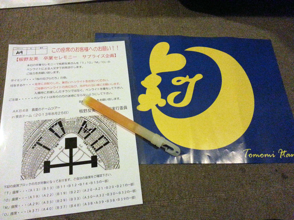 Itano estuvo acompañada en la ceremonia por sus ex-compañeras graduadas, Atsuko Maeda (22) y Mariko Shinoda (27), quienes junto a 42,000 wotas reunidos en el máximo escenario disfrutaron de las canciones como solista de "Tomochin", destacando su tema debut "Dear J" interpretada en el cuarto encore.