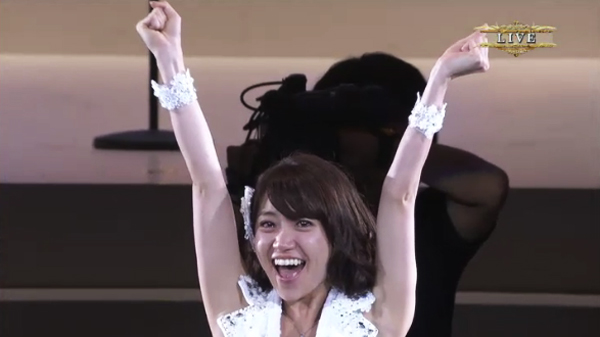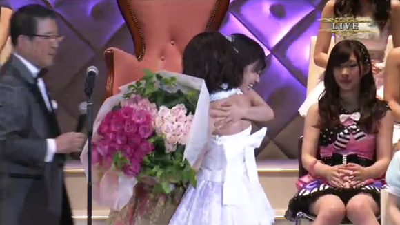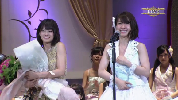 A través de una transmisión en vivo por la plataforma de la red social Google+, se pudo seguir el evento, en el que hizo acto de presencia la gran ausente de las elecciones, Atsuko Maeda (20), quién entregó personalmente un ramo de flores y dirigió unas emotivas palabras a Oshima.