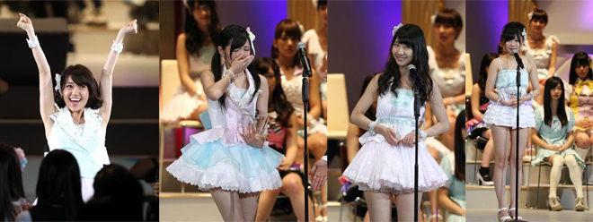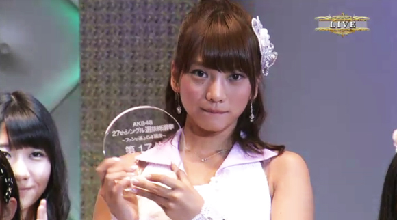 Mayu Watanabe (18) se tuvo que conformar con el segundo lugar, Yuki Kashiwagi (20) aseguró el tercer sitio y Rino Sashihara (19) finalmente no pudo remontar la cuarta posición, a pesar de los 1770 votos que recibió de un sólo Kimo-Wota.