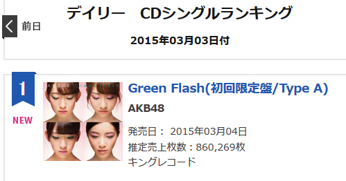 (Update) De acuerdo a la lista diaria del Oricon, el sencillo número 39 de AKB48 «Green Flash», se ubicó en la cima del ranking al contabilizar un total de 860, 269 copias adquiridas durante su primer día de ventas.