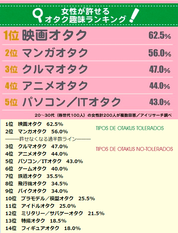 Los tipos de otakus mejor recibidos por las mujeres son los «Eiga otaku» (otakus de películas), con el 62% de aceptación, seguidos por los «Manga otaku» con un 56%. Los «kuruma otaku» (otakus de autos) tienen el 47% de aceptación, mientras que los «Anime otaku» son bien recibidos por el 44% de las mujeres. Los «Pasokon otaku» (otakus de computadoras) tienen el 43% de tolerancia por parte de las mujeres, los «game otaku» el 40%, los «tetsudo otaku» (otakus de trenes) el 35%, los «hikouki otaku» (otakus de aviones) el 34.5%, los «bike otaku» (otakus de motocicletas) el 34% y los «mokei otaku» (otakus de modelos a escala) el 25.5%.