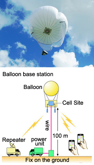 La antena ó célula se colocó en un globo a 100 metros por encima del suelo cerca del rio Kiso en Inazawa, prefectura de Aichi, y el dispositivo puede ser utilizado por varios centenares de usuarios en un radio de 3 a 5 kilómetros para hacer llamadas telefónicas al mismo tiempo.