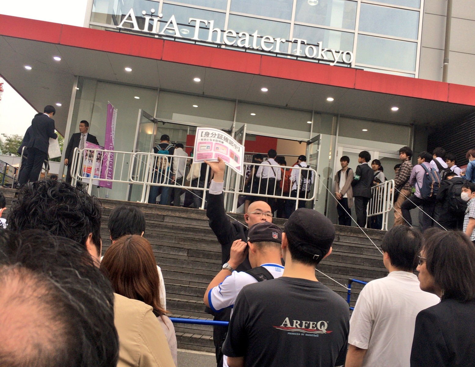 Personal de Nogizaka46 dando la informacion del nuevo requisito de ingreso al auditorio.
