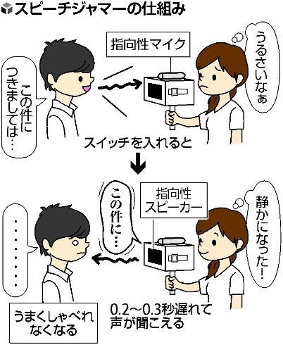 El dispositivo se llama «Speech Jammer» y consiste en un micrófono, un altavoz direccional y un rayo laser para fijar el objetivo montados en un artefacto tipo pistola.