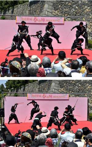A medida que la multitud observaba con asombro, los siete Ninjas ofrecieron su espectáculo en el escenario al pie del Castillo, en un evento especial celebrado con motivo del «Kodomo no Hi» (día del niño), una festividad nacional.