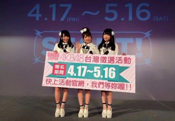 A finales de la semana pasada tres integrantes de AKB48 visitaron la capital de Taiwán para promocionar las audiciones que se celebran en esa ciudad con el fin reclutar a integrantes extranjeras para el grupo de Akihabara. El periodo de inscripciones para las solicitantes se abrió el 17 de abril y concluirá el 16 de mayo.
