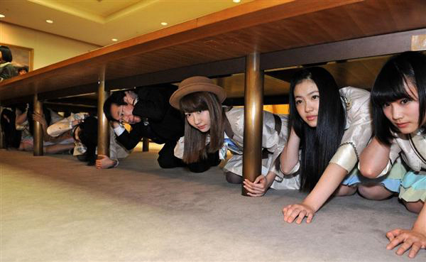 El alcalde de la ciudad, Kizo Hisamoto (60), recibió a las idols y las acompañó en un simulacro de terremoto al interior de las oficinas de gobierno, protegiéndose debajo de una gran mesa del salón de juntas.
