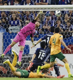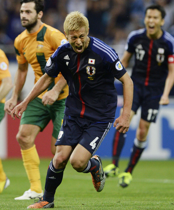 Japón se ha convertido en el primer país en clasificar para la copa mundial de futból del próximo año en Brasil, luego de un dramático final en el partido celebrado el 4 de junio entre las selecciones de Japón y Australia, donde Keisuke Honda cobró exitoósamente un tiro penal en el tiempo de compensación para empatar el partido 1 a 1.