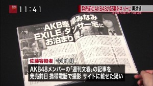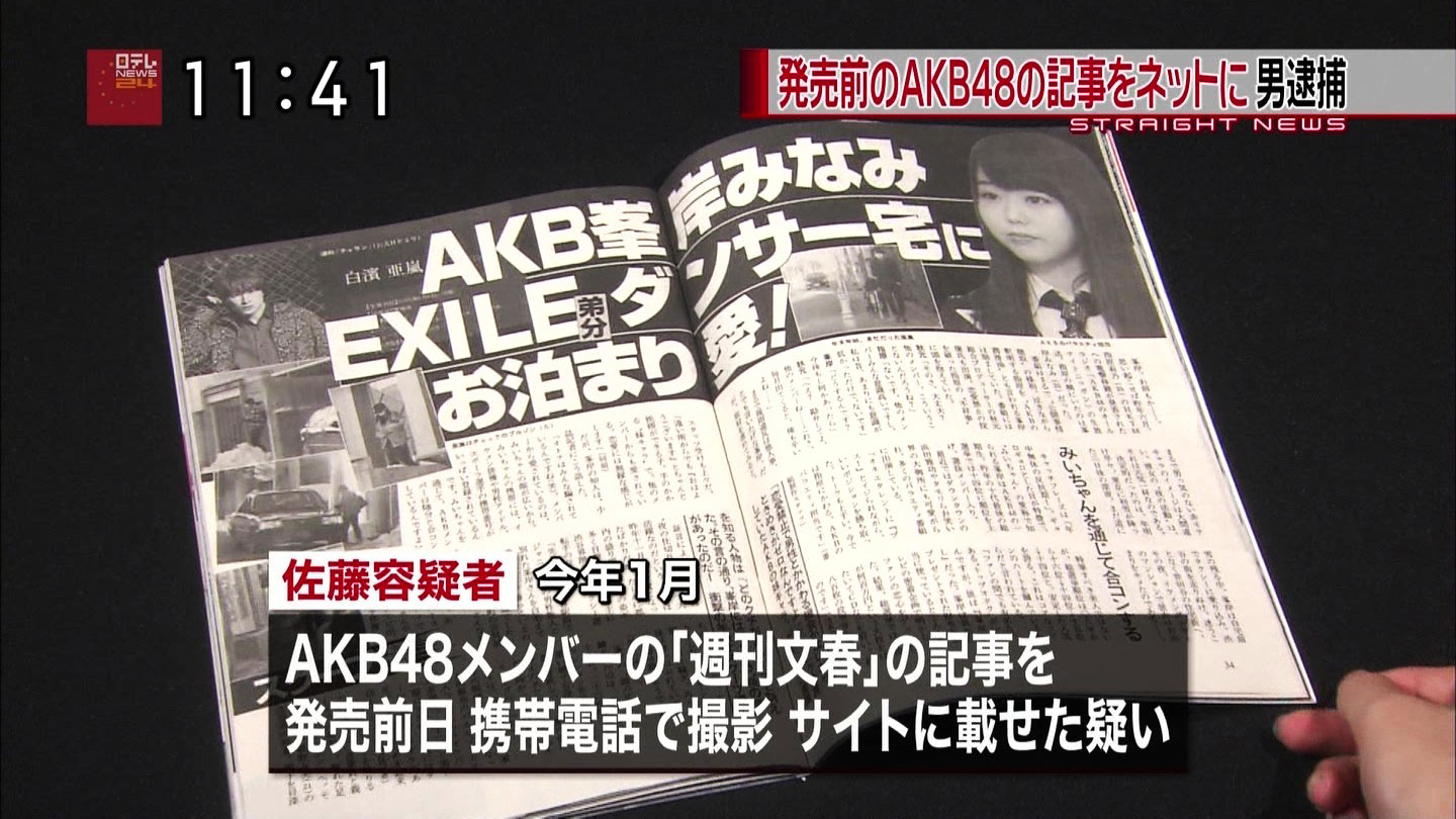 Sato se desempeñaba como trabajador de medio tiempo en el tabloide y unos días antes que se publicara el número de la revista con el revelador artículo de la relación prohibida de la AKB, filtró dicha información a la red sin el consentimento de la editorial, según informó la policía metropolitana de Tokyo.
