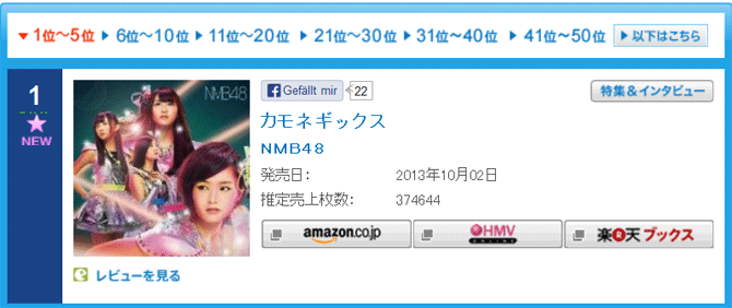 El grupo idol de Osaka, NMB48, se logra ubcar en la cima del Oricon semanal con su nuevo sencillo "Kamonegikkusu", lanzado el pasado 2 de octubre, contabiliando hasta ahora 374,644 copias vendidas, convirtiéndose en el séptimo sencillo del grupo que se ubica en el primer lugar de las listas.