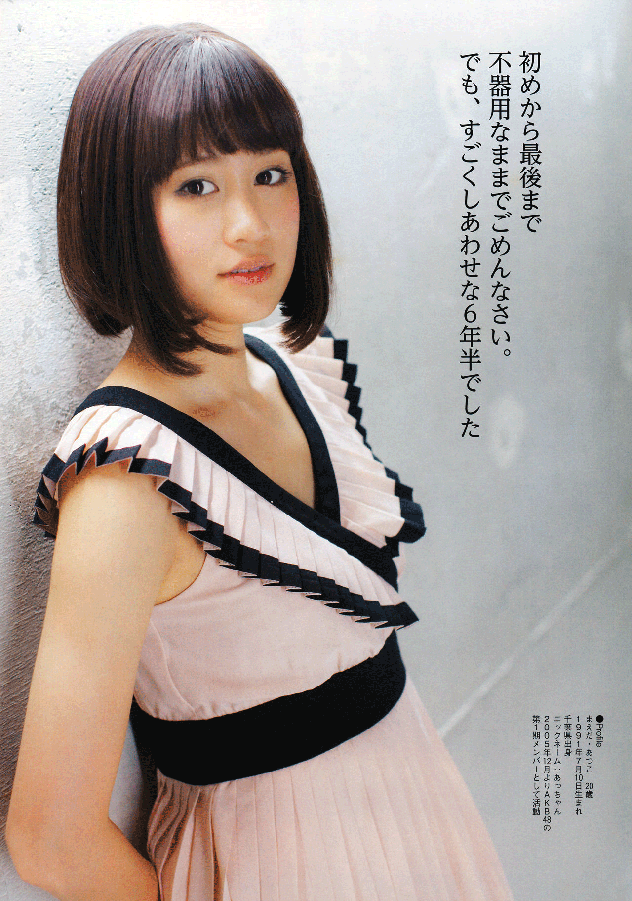 Hablamos de AKB, sobre otras integrantes, acerca de las más jóvenes, acerca de los wotas y del futuro de la misma Maeda. Uno por uno hablamos sobre esas cosas. Me conmovió ver a aquella tímida chica de 14 años de edad que siempre se escondió en un caparazón y ahora se había convertido en una mujer de 20 años, que se preocupa por los demás y que compartió esos sentimientos conmigo.