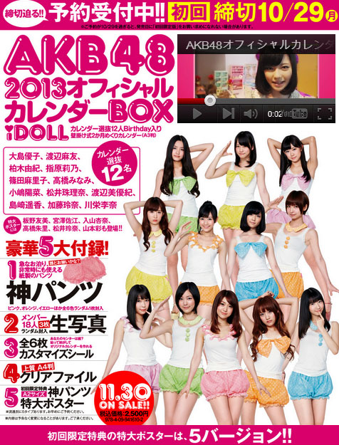 Por otra parte, el próximo 29 de octubre se pondrá a la venta el calendario 2013 «iDOLL», publicado por la editorial Shogakukan, donde un grupo selecto de 12 integrantes de la familia 48 aparecerán en un paquete especial de colección y el cual incluirá un short (pantalón corto) como el que las chicas utilizan en las fotografías.