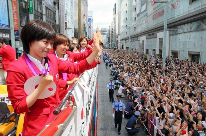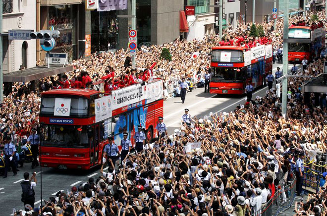 El campeón masculino de gimnasia, Kohei Uchimura, mostró su medalla de oro con una gran sonrisa mientras saludaba a la multitud a su paso por la avenida. Las medallas obtenidas por Japón en los juegos fue un total de 38, la mayor cantidad de preseas que ha cosechado el equipo olímpico nipón.