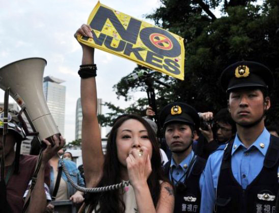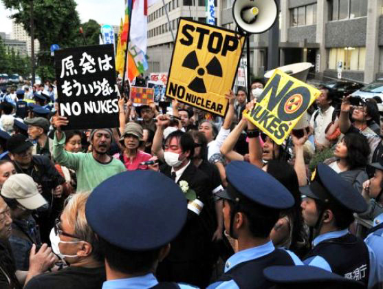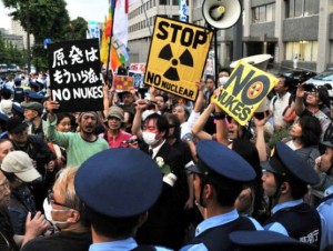 «No al re-encendido!», gritaban los manifestantes, que eran dirigidos por el periodista Satoshi Kamata y por el ganador del Premio Nobel Kenzaburo Oe, quien inició una petición anti-nuclear que hasta ahora ha reunido más de 7.5 millones de firmas.