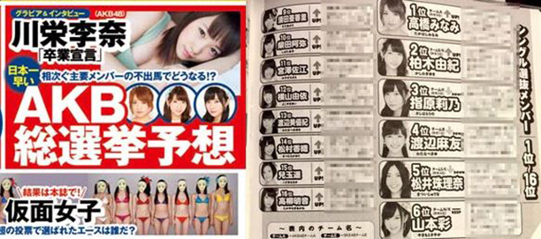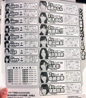 Por otra parte, el lunes 13 de abril se divulgó una publicación adelantada del Weekly Playboy ( a la venta el 27 de abril) donde se revelan las primeras tendencias en las votaciones del Sousenkyo de AKB48 de este año, ubicando a Minami Takahashi en el primer lugar de las preferencias electorales.
