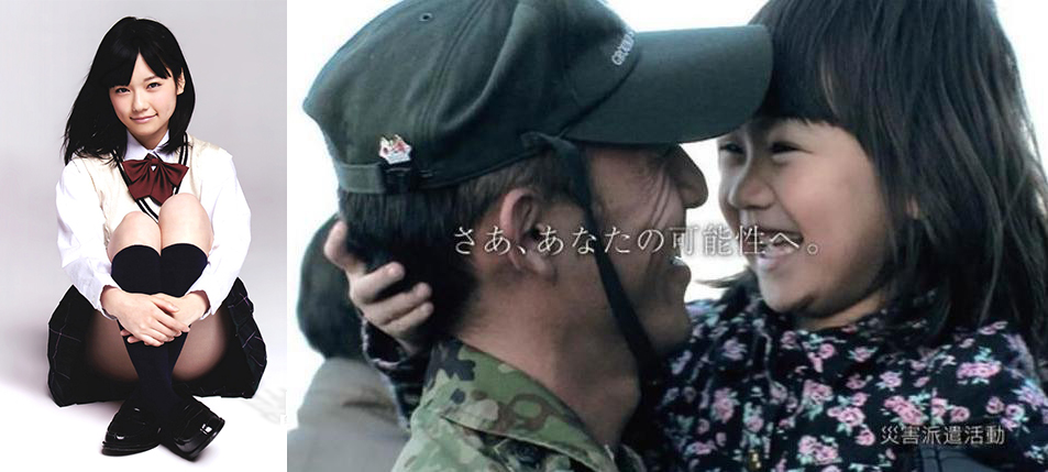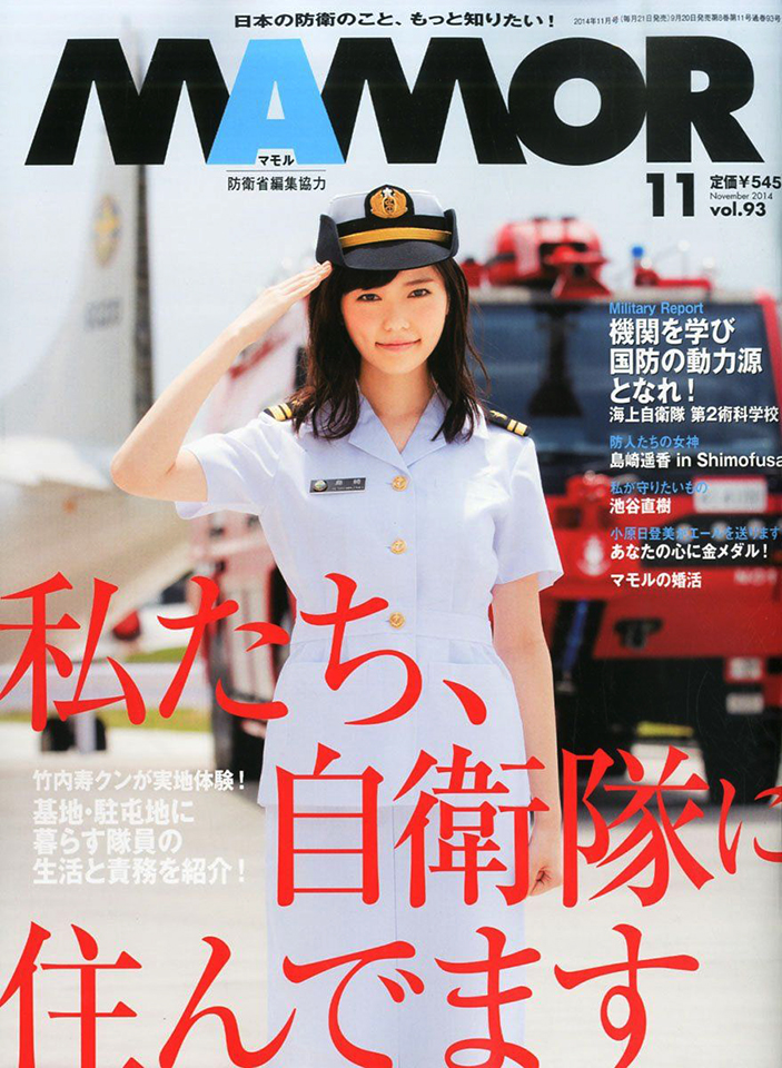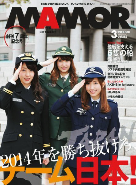 MAMOR (Mamoru) es la revista oficial del ministerio de defensa japonés y en sus portadas recurentemente utiliza a celebridades femeninas para atraer nuevos reclutas, en la imagen, tres integrantes de AKB48 aparecen en la portada de un número de la revista publicado en el 2014.