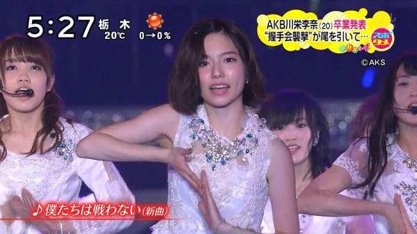 La canción se titula: «Bokutachi wa tatakawanai» (Nosotros no lucharemos) y se trata del sencillo número 40 del grupo, el cual saldrá a la venta el próximo mes, y que pretende mediante el baile brindar un mensaje de paz: «Bokutachi wa tatakawanai» (nosotros no lucharemos)/ «Ai wo shinjiteru» (creo en el amor) /» El odio es una cadena/ que ahora yo rompo», son algunas de las frases de este nuevo tema.