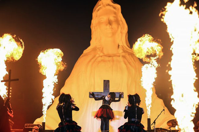 En el concierto ofrecido el sábado, las metaleras utilizaron la imagen de una virgen María como parte del escenario, mientras una de sus integrantes apareció «crucificada» como parte de su performance.