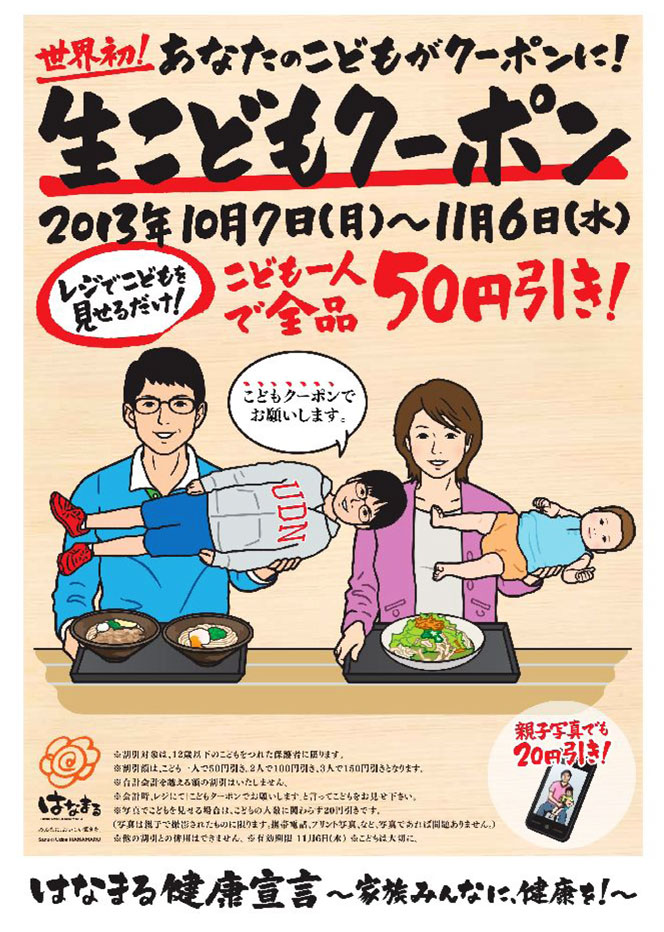 La franquicia de comida "Hanamaru Udon", que vende los populares tallarines jponeses Udon, está ofreciendo un descuento de 50 yenes en la compra de sus platillos por cada "hijo vivo" que los clientes lleven a sus restaurantes a partir del 7 de octubre y hasta el 6 de noviembre.