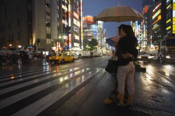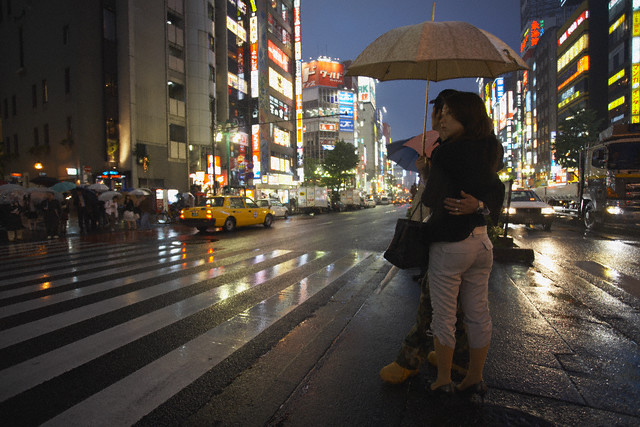 13 May 2006, Tokyo, Japan — Shoppers walking through neon-lit Shinkuju District during spring rain storm. — Image by © Paul Souders/Corbis
