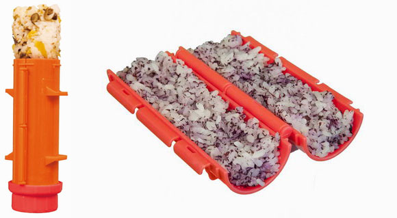El ingenioso dispositivo de cuatro piezas de plástico puede empacar el arroz y sus rellenos favoritos y por medio de una rosca en su parte inferior, el usuario puede comer el contenido.