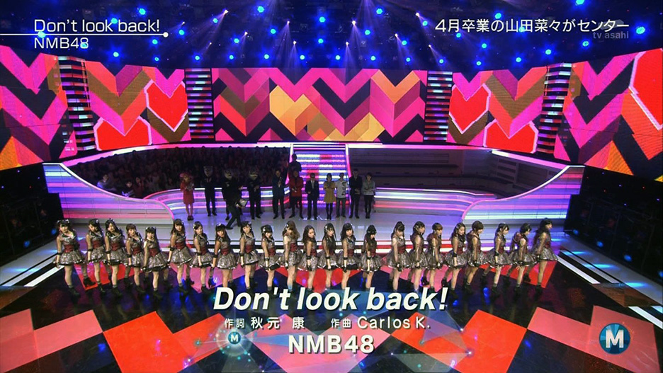 anmbananaEl viernes 13 de febrero el grupo idol de Osaka, NMB48, presentó por primera vez en el programa musical de TV Asahi, Music Station, su sencillo número 11, el cual se titula «Don´t look back!», y que será lanzado el 31 de marzo simultáneamente al sencillo número 17 de SKE48.