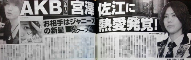 El tabloide Shukan Bunshun en su edición de esta semana, publica un nuevo artículo que vincula sentimentalmente a Sae Miyazawa (22), integrante original de AKB48 pero que actualmente se encuentra de préstamo en el grupo de Shanghai SNH48, con Tatsuya Fukasawa (21) miembro del grupo idol masculino "Snow Man", perteneciente a la divisón junior (artistas menores de 30 años de edad) de la agencia Jhonny & Asociataes.