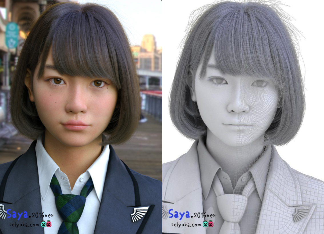 Un matrimonio de desarrolladores de CGI (gráficas por computadora) japoneses, conocidos como «Telyuca» -Teruyuki Ishikawa y Yuka Ishikawa-, presentaron esta semana imagenes de su versión mejorada de una colegiala japonesa llamada «Saya», quién a simple vista parece ser una chica de carne y hueso real, sin embargo, se trata de un modelo 3D creado por computadora y logrado con un alto nivel de realismo.