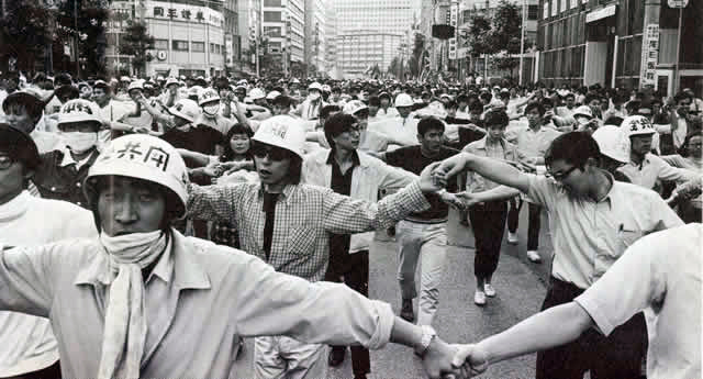 Se decide convocar a una gran marcha hasta Tokyo, donde obreros y estudiantes acuden armados con palos y los rostros cubiertos.