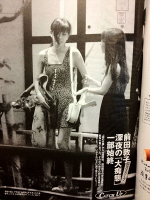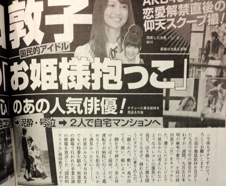 El tabloide Shukan Bunshun en su edición impresa para esta semana y en su sitio web, ha publicado este 11 de septiembre una serie de lamentables imagenes donde se puede observar a la recién graduada del grupo idol AKB48, Atsuko Maeda (21), presuntamente en estado de ebriedad, y que de acuerdo al tabloide es acompañada por Yuko Oshima, actual chica centro de AKB y capitán del equipo K y de Haruka Nakagawa, reciéntemente integrada a JKT48.