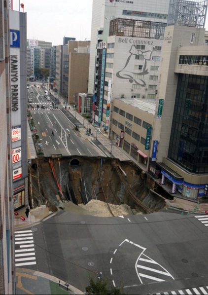 Dos tramos de una calle principal de cinco carriles en el distrito de Hakata se colapsaron alrededor de las 5:15 de la mañana. Los dos agujeros crecieron gradualmente y eventualmente se convirtieron en uno solo.