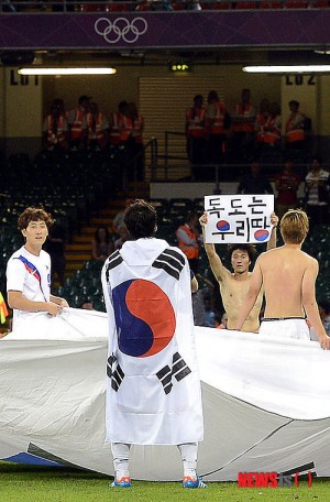 Al término del partido los jugadores sudcoreanos desplegaron una gran bandera de su país mientras mostraban pancartas que decían : «Dokdo es territorio Coreano», en alusión a las islas en disputa que horas antes había visitado el primer ministro de su país.