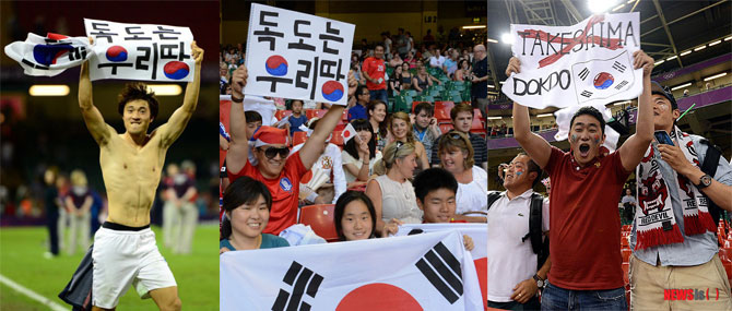 Aficionados en las tribunas también mostraron su nacionalismo al llevar banderas y pancartas que negaban el nombre japonés de las islas (Takeshima) poniendo en su lugar el nombre coreano de Dokdo.