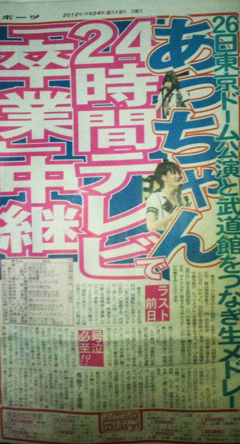 En las primeras horas del Domingo 19 de Agosto (hora de Japón) diarios nipones han publicado que la cadena de televisón NTV durante su transmisión de un programa especial de caridad de 24 horas, incluirá un enlace en vivo al último de los tres conciertos que AKB48 llevará a cabo en el Tokyo Dome el Domingo 26 de Agosto, en el que será la última presentación de Atsuko Maeda (21) en un escenario multitudinario antes de su graduación.