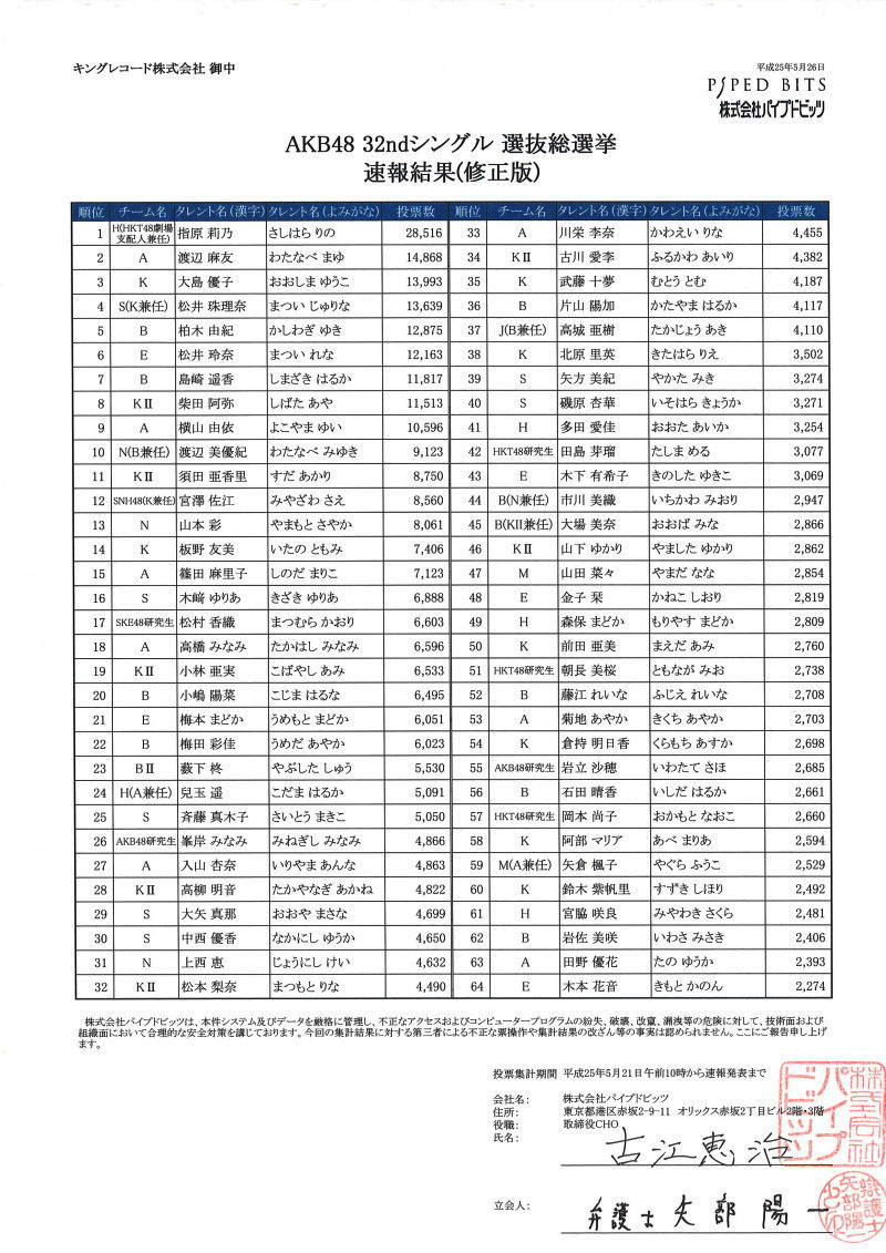 Debido a lo anterior, el domingo 26 de mayo se publicó una nueva lista preliminar en donde aparecen los números corregidos, sin registrar por cierto cambios sustanciales, ya que Sashihara sigue casi con el doble de votos por encima de Watanabe, pero que de acuerdo a las cifras oficiales, «Sashiko» habría recibido 47 votos ilegales, la mayor cantidad de votos fraudulentos encontrados hasta ahora.
