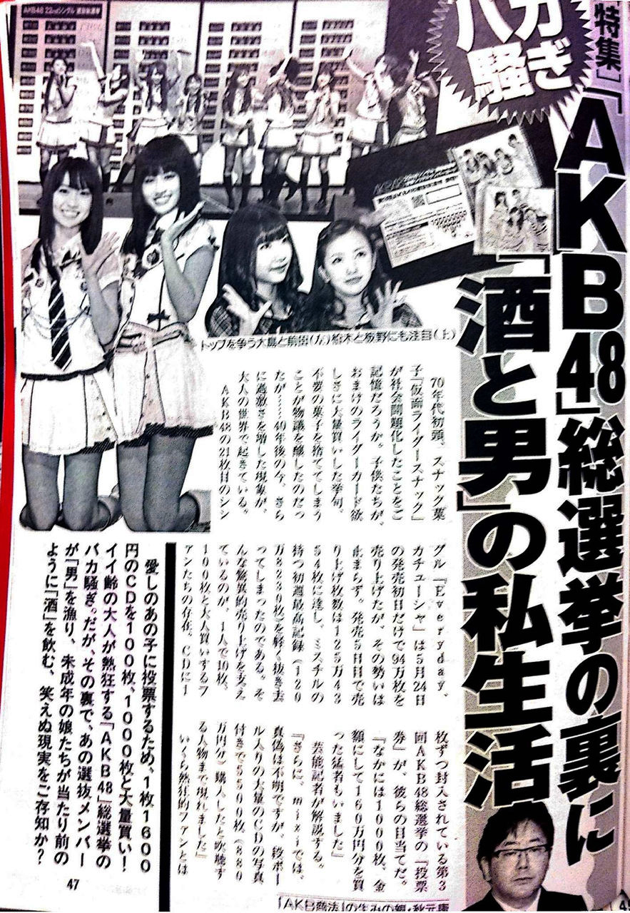 Por su parte, el tabloide Shukan Bunshun también publicó un articulo inmediatamente posterior a la elección Senbatsu de este año, donde afirma que una noche antes del Sousenkyo, celebrado en el Nissan Stadium el pasado 8 de junio, varias integrantes de AKB48, incluida la gerente general Minami Takahashi, Haruna Kojima, Mariko Shinoda, Tomomi Itano y Minami Minegishi acudieron a un bar de strippers con compañía masculina.