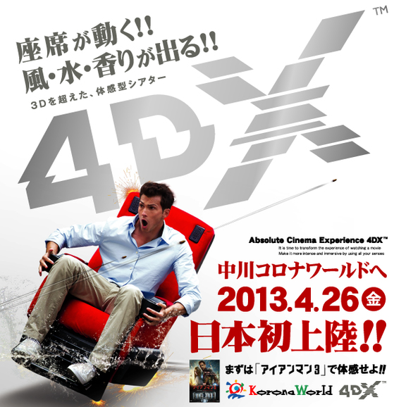 La cadena de cines nipona, «Korona World», ha anunciado que abrirá en Nagoya el 26 de abril la primera sala de cine del país que ofrece el sistema «4D», en el que los cinéfilos podrán vivir una experiencia total al «sentir» y ver las películas.