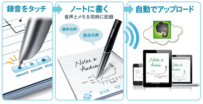 Al presionar la punta del bolígrafo contra los controles impresos, puede hacer que ésta realize diferentes funciones, desde registrar lo trazado en el cuaderno, hasta grabar el audio local del usuario quién puede hacer comentarios en el momento que se utiliza el dispositivo, un aspecto útil para complementar la nota escrita. La pluma cuenta con una memoria interna de 2 GB para almacenar la información mientras se encuentra disponible una conexión wi-fi que sube los datos a la "nube" de Evernote.