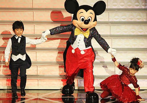 Le siguieron los pequeños actores y cantantes Mana Ashida (rojo) y Fuku Suzuku (blanco) en una accidentada colaboración cantando «Maru maru mori mori», acompañados de niños bailarines y de personajes de Disney.