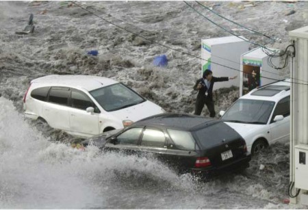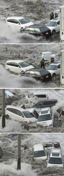 En la siguiente serie de fotos tomadas por un funcionario del ministerio de Tierra, Infraestructura, Transporte y el Turismo publicadas el viernes, un reportero de la Shimbun Iwate Tokai de nombre Toya Chiba, de pronto aparece rodeado por las aguas del tsunami a las 3:25 pm del 11 de marzo en Kamaishi, Prefectura de Iwate, mientras filmaba con su cámara de vídeo.