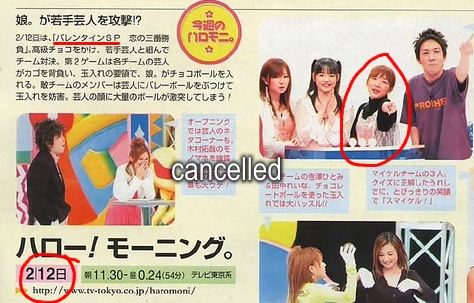 La crisis ha llevado a la edición del programa «Hello» Morning» del próximo 12 de febrero, cuyo título original «Valentine Special» ha sido modificado por el de «Owarai special», donde se han quitado todas las escenas con Ai Kago.