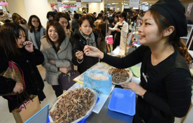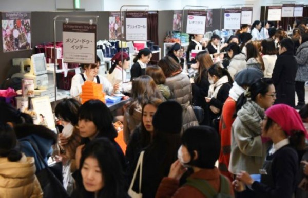 Mujeres japonesas se vieron envueltas en estampidas y codazos para comprar el chocolate de San Valentín en las tiendas el 14 de febrero, fecha en que se acostumbra que las féminas exclusivamente obsequien a los hombres la preciada golosina.